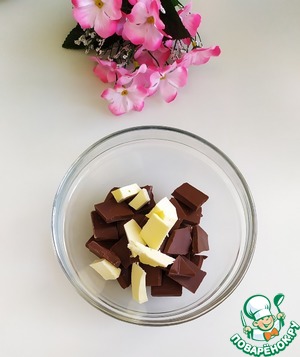 Для глазури в чаше соединить шоколад, поломанный на дольки и сливочное масло. Растопить в микроволновке или на водяной бане. Перемешать до однородной консистенции.
