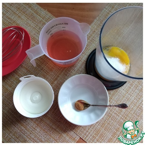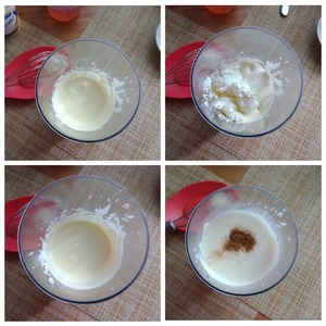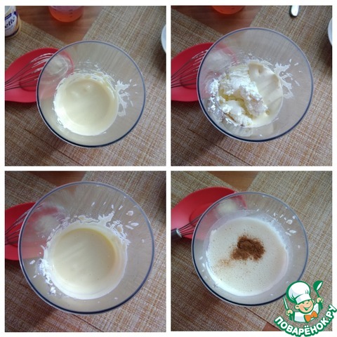 Желтки нужно растереть с сахаром добела. Добавить сыр и продолжать соединять. Очередь сока. Наливаем сок и я добавлю ещё корицу. Кто корицу не любит, её можно не класть.