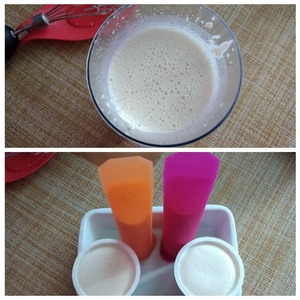 Всё соединяем венчиком до однородной массы. Она будет жидкая, но это не страшно. В морозильной камере всё отлично застынет. Разливаем массу по формам. У меня есть 2 формы силиконовые, из них не нужно будет вытряхивать мороженое, а есть его, выдавливая, держась как за стаканчик. Два мороженого я сделаю в одноразовых стаканчиках для кофе. Помещаем в холодильник. Чтобы легко извлечь мороженое из стаканчиков кофейных за палочку, нужно стаканчик очень быстро поместить в кипяток.