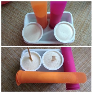 Часа через 2 я достала стаканчики с мороженым. В них масса уже немного застыла и я воткнула палочки для мороженого. Опять отправила стаканчики в морозильник. Делала мороженое на ночь. К утру оно будет отличное.