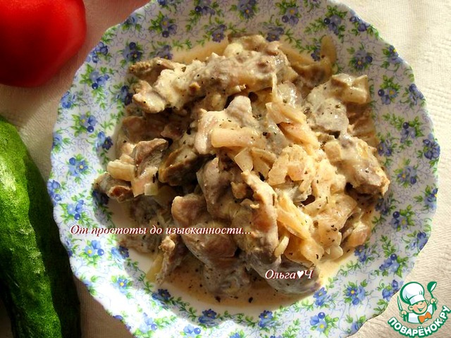Посыпаем мукой и тщательно перемешиваем, добавляем сметану и бульон в котором варились желудки (1, 5 -2 стакана), выдавливаем чеснок, солим, перчим и тушим ещe 5 минут. Сметану можно заменить томатной пастой.