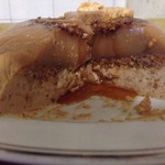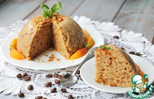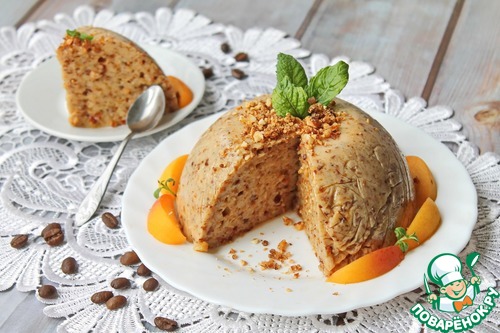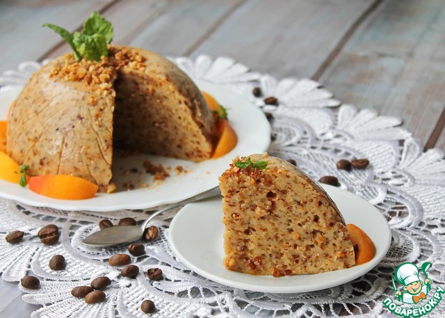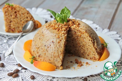 А вот теперь самое интересное. Структура и вкус у этого суфле, за счет того, что в нем пралине, меняется со временем. Если первые часы это плотное суфле с хрустящей ореховой крошкой. То через 12 часов, это уже более нежное суфле с влажными орешками. Хруста практически уже нет. А еще через 8 часов суфле имеет дырочки и довольно сырой. Растаявшая карамель вытекает как сироп. Так что вроде суфле одно, а вкусы меняются. После того как суфле застынет, переверните на тарелку, уберите пленку и украсьте оставшимся пралине и мятой. Ну, я еще добавила абрикосы, они прекрасно вписались сюда.