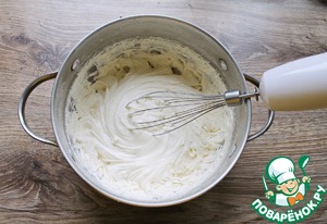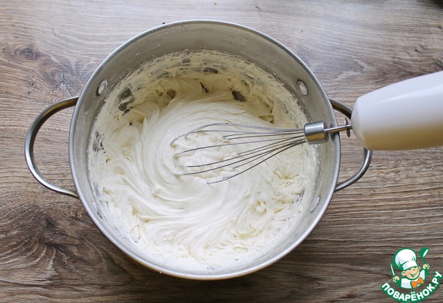 В миску вольем сливки, добавим сахарную пудру и взобьем на средней скорости до плотных пиков. Только смотрите не превратите все в масло.