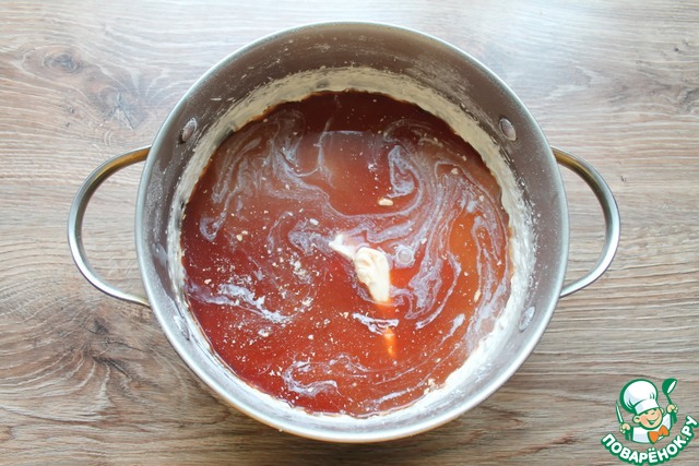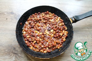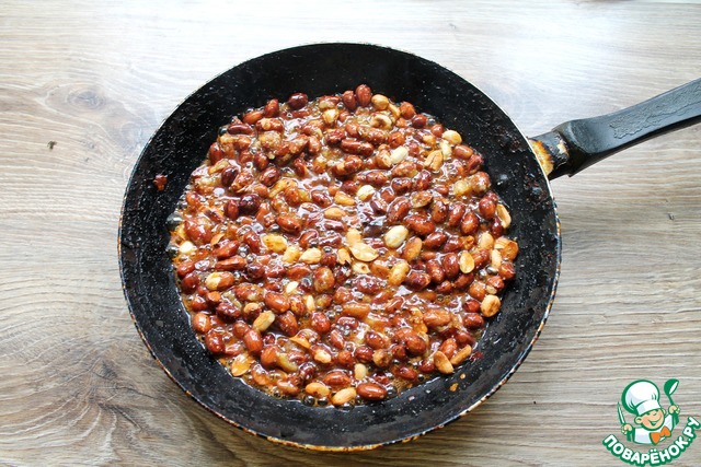 Пока набухает желатин, сделаем пралине. На сковороду положим орехи и поставим их на средний огонь и немного поджарим. Затем всыпаем сахар, прибавим огонь и будем, перемешивая, нагревать до растворения сахара и превращения его в карамель.