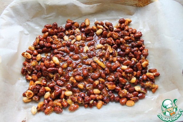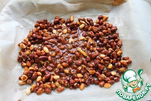 Противень застелите бумагой для выпечки, смажьте сливочным маслом и переложите орехи в карамели, разровняем. Уберем до остывания в прохладное место.