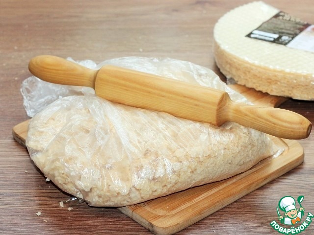 1. Вафельные коржи выложить в пакет и измельчить скалкой.