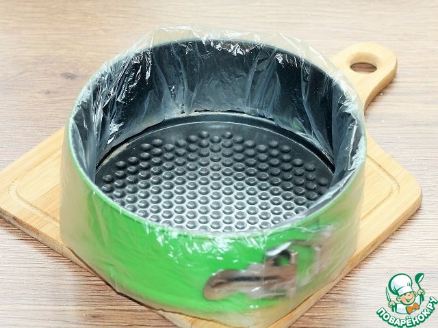 4. Приготовить разъемную форму Ф=18 см для выпечки. Извлечь донышко и положить прозрачный пакет. Возвратить дно формы на место и застелить бумагой для выпечки.