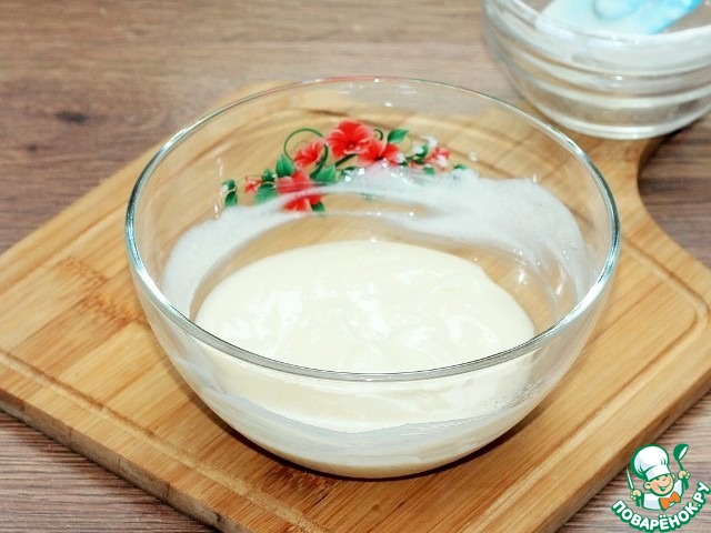 8. Сметану (300 гр) взбить с сахаром (160 г) до растворения сахара. Разделить смесь на 2 части. Одна часть сметаны - для кофе, вторая - для какао.