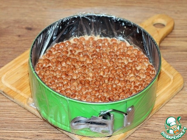 5. Выложить вафельную крошку на дно формы и равномерно утрамбовать ложкой. Убрать форму в холодильник.