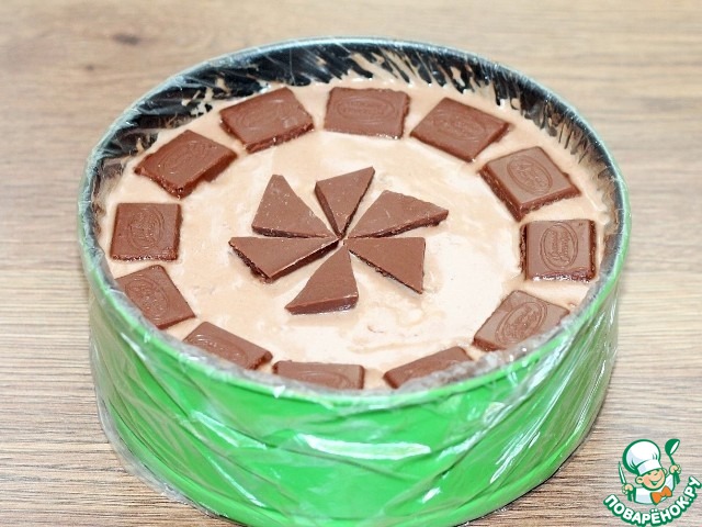 15. Заливаем остывший кофейный слой шоколадным. Могут появиться пузырьки, но при охлаждении торта, они исчезнут. Ставим формочку в холодильник для застывания шоколадного слоя.