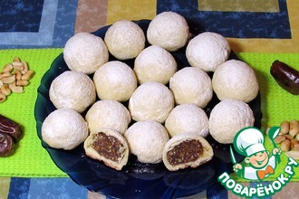 Тесто слегка размять на ладони, выложить несколько кусочков кураги, скрепить плотно, скатать шарик.