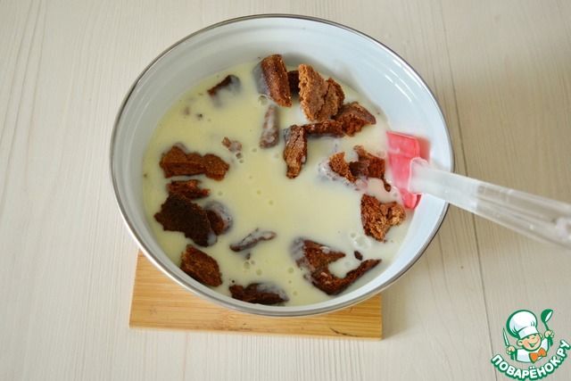 Вылейте горячий пудинг на кусочки поломанного коржа (печенья), перемешайте. Охладите слегка, чтобы масса была тёплой