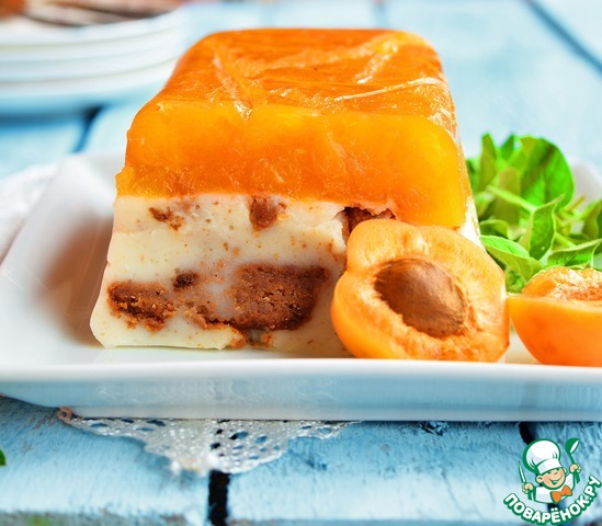 Летний холодный двухслойный десерт-желе. Нижний слой - ванильный пудинг с кусочками шоколадного печенья. Верхний слой - абрикосовое желе.