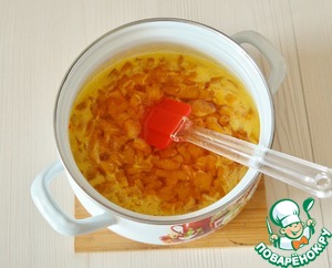 Предварительно замочите желатин в холодной воде на 10 минут. Снимите абрикосовую массу с огня и введите при помешивании набухший желатин.