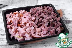 У мяса удалим косточки, кожу (если есть) и жир, а мякоть нарежем на небольшие кубики. Перемешаем.