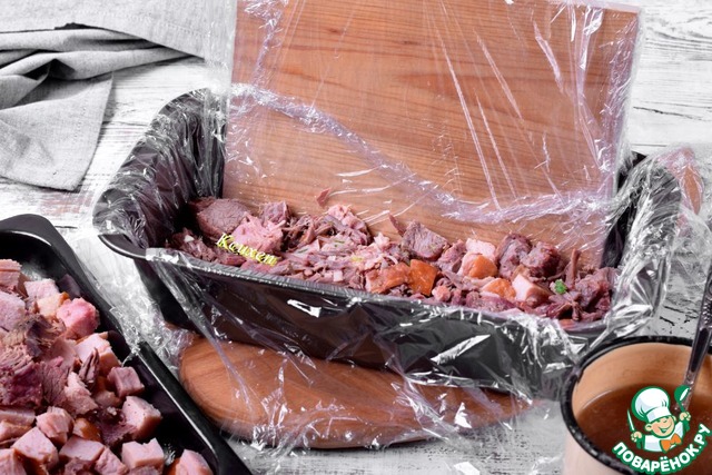 Прямоугольную форму выстелим пищевой пленкой так, чтобы ее края свисали. На дно формы нальем 1-2 ст. л. бульона с желатином и насыплем немного зеленой прослойки, а затем выложим 1/3 мяса. Слегка утрамбуем. -