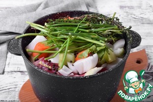 У петрушки оборвем листочки и пока отложим в сторону, а стебли скоро понадобятся. Морковь, лук и сельдерей нарежем крупными кусками.