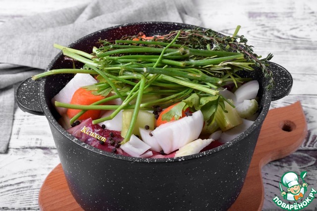 В сотейник подходящего объема сложим 4 вида мяса, добавим нарезанные овощи, специи, пучок душистых трав и стебли петрушки. Вольем вино, а затем – воду. Количество воды зависит от объема сотейника. Мне понадобилось 600 мл, чтобы вода заполнила посуду почти до краев.