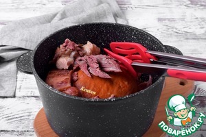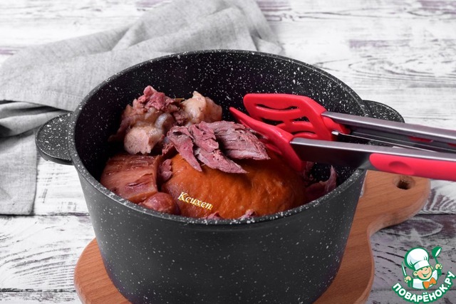Поставим сотейник на средний огонь и доведем все до кипения, снимая образующуюся пену. Как только бульон закипит, убавим огонь до минимума, прикроем сотейник крышкой, и будем варить мясо 4 часа.