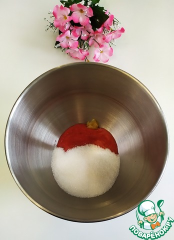 В чаше соединить пюре клубники (125 г.), яблочное пюре (125 г.) и сахар.