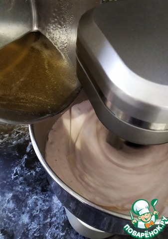 Осторожно, тонкой струей вливать сироп в сбившуюся массу. И продолжать взбивать не дольше 1 минуты.