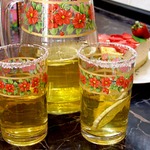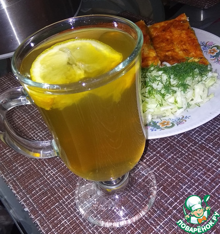 Перед подачей в графин положить лёд (не обязательно) и нарезанный лимон, и через ситечко процедить чай. |