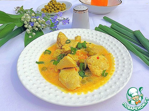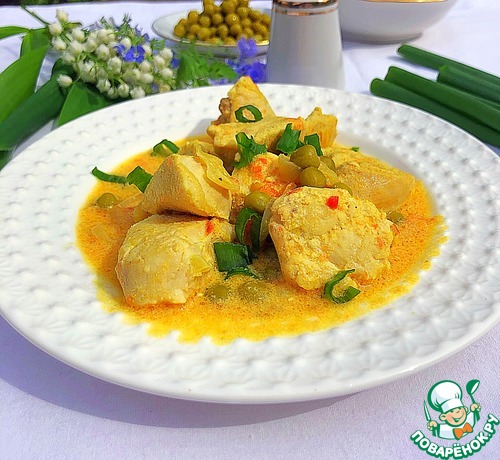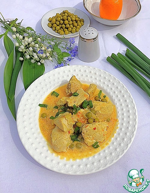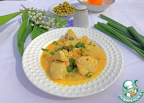 Добавить горошек и оставить томиться на медленном огне ещё минут 5. Подавать курочку со свежей зеленью.