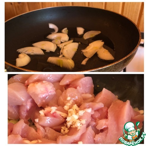 Лук нарезать полу кольцами и обжарить 5 минут на растительном масле. Добавить грудку нарезанную небольшими кусочками и чеснок мелко порубленный. Перемешать и продолжать обжаривать на средне-сильном огне минут 7-10.