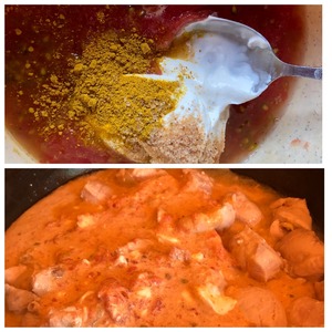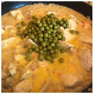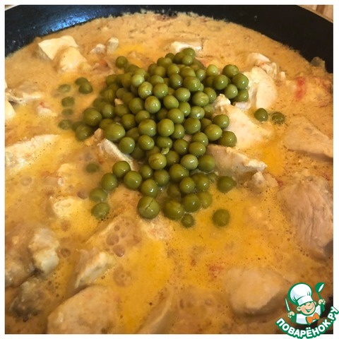 Помидор натереть на тёрке, к нему добавить сметану, специи, карри и 4 ст л жидкости с консервированного горошка. Заливку перемешать и добавить к курочке. Перемешать все, огонь убавить и тушить 10 минут при закрытой крышке.