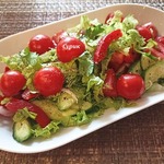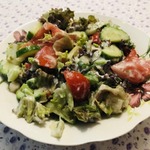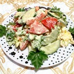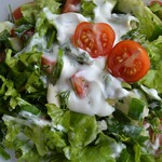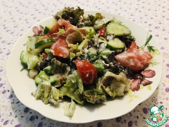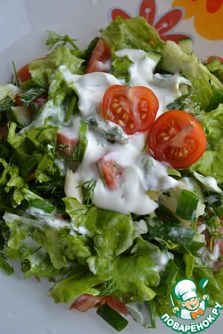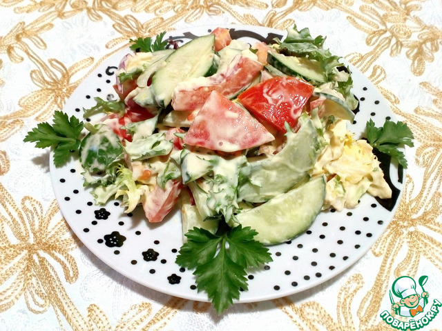 Легкий и полезный салат из свежих овощей с чесноком, заправленный йогуртом.