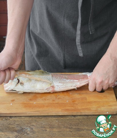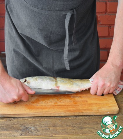 Сделайте два надреза вдоль рыбы: по спинке и по брюшку. Надрезы делайте неглубокие, прорезайте только кожу.