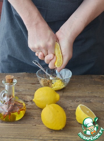 Для приготовления горчичной макалки: смешайте обычную и зернистую горчицу, добавьте немного оливкового масла, цедру и сок лимона, соль и сахар по вкусу