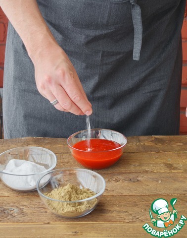 Для томатной макалки: смешайте томатную пасту с водой, уксусом, солью, сахаром и перцем. Добавьте по вкусу табаско.