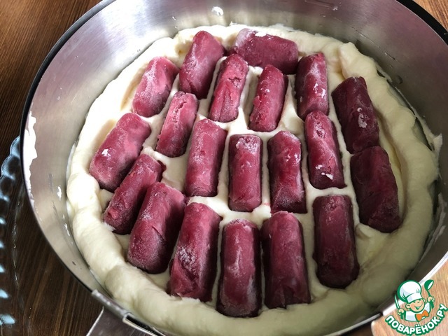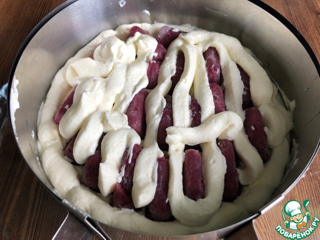 - Тесто перекладываем в форму ( диаметр 18 см) для выпекания, смазанную маслом.