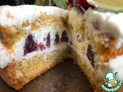 - Первый слой бисквитный корж +пропитка + крем + ежевичное компоте