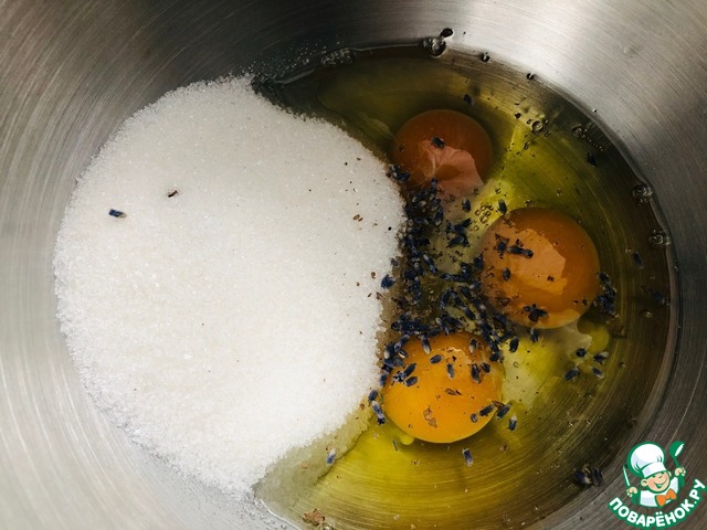 - Взбиваем яйца с сахаром и цветками лаванды на самой высокой скорости миксера 5 - 7 минут.