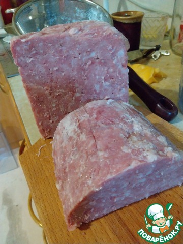 Хорошенько вымесить фарш руками или при помощи К-образной насадки кухонной машины до "липкого" состояния и образования "белых" нитей в фарше. Фарш переложить в пакет и отбить. Ветчинницу простелить пакетом для запекания или для ветчинницы, плотно выложить туда отбитый фарш, плотно завязать край мешка, закрепить механизм согласно инструкции к вашей ветчиннице, отправить в холодильник на 12-24 часа для созревания.