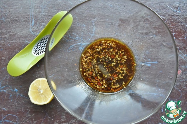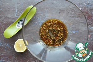 Для соуса смешать оливковое масло, сок половины лимона, соевый соус, имбирь, измельченный чеснок, хлопья чили перца, листочки тимьяна и молотый черный перец.