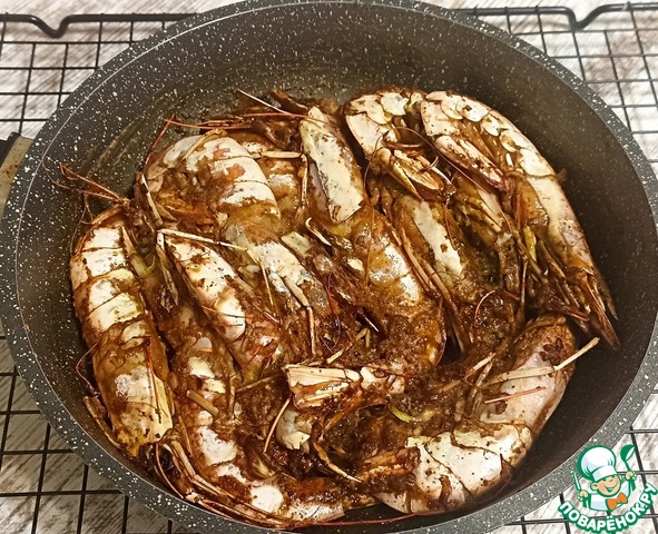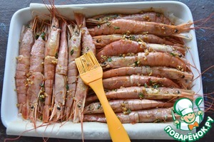 Форму выстелить фольгой или пергаментом, разложить подготовленных лангустинов и обильно смазать их маринадом. Оставить на 15 минут. За это время разогреть духовку до 200 градусов.