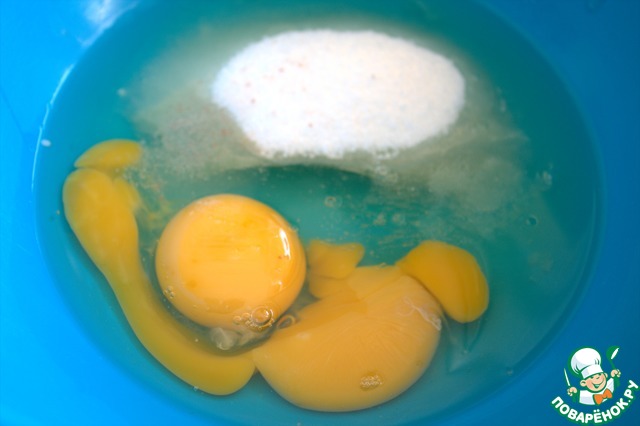 Все продукты берём комнатной температуры. В яйца всыпать сахар и ваниль. По рецепту 3 яйца, но я использовала 1 желток в сырники и здесь 2 яйца и 1 белок. Сырники можно посмотреть здесь: https://www.povareno k.ru/recipes/show/16 5397/