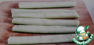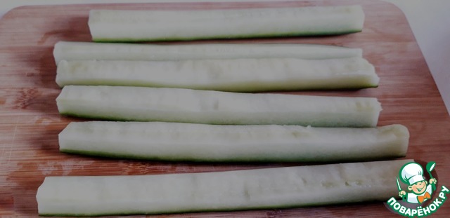 Всё очен просто, берём огурец, режем вдоль пополам, и ещё раз пополам, удаляем мякоть ( чтобы не дал сок )