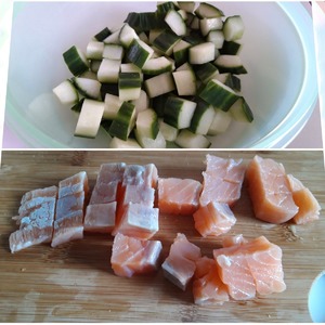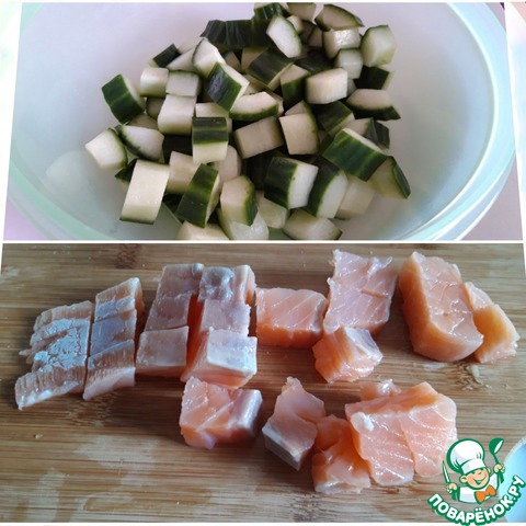 Лосось нарезаем на мелкие кубики, оурец тоже мелко нарезаем