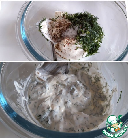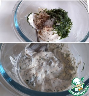 Смешиваем сметану, йогурт, лимоный сок, соль, перец и укроп
