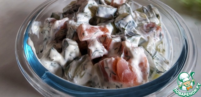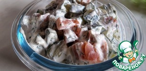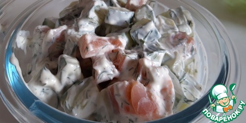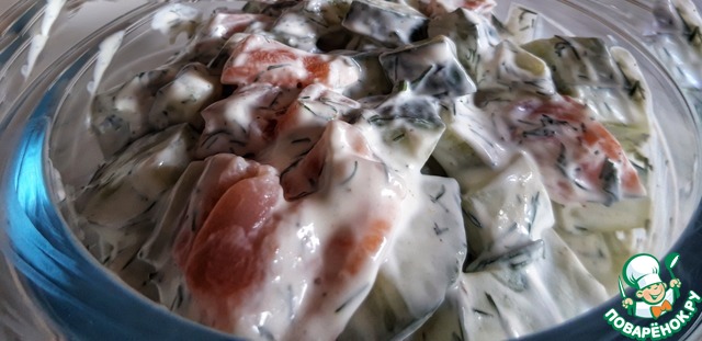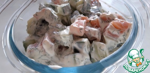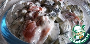 В чашке смешиваем огурец, лосось и заправку, хорошо перемешиваем, и отправляем в холодильник на два- три часа.