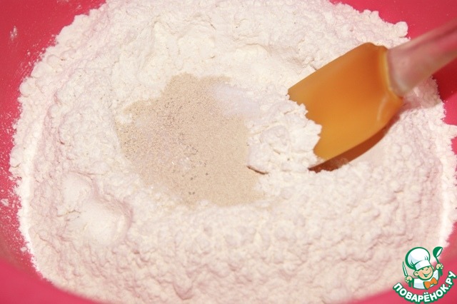 В емкости смешать муку, соль, сахар и дрожжи. -