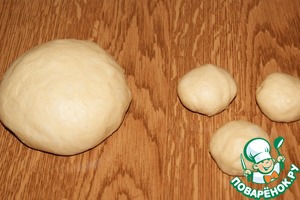 Большой кусок теста скатать в шар. Маленький разделить на 3 части и тоже скатать их в шарики. Накрыть полотенцем и дать отдохнуть 15 минут.
