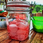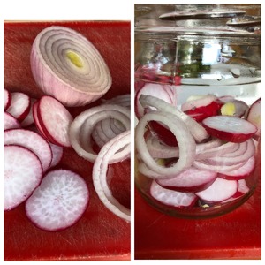 Редис нарезать тонкими слайсами, лук колечками. В банку (0,5 л) укладываем поочерёдные редис и лук.
