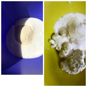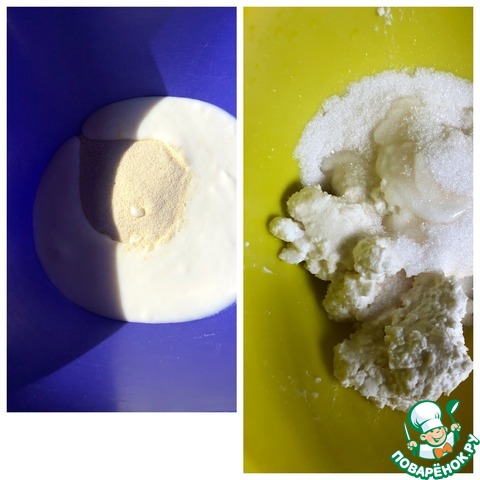 В манку влить кефир, перемешать и оставить набухать минут на 20-30. Творог перетереть с сахаром, маслом и ванилином.