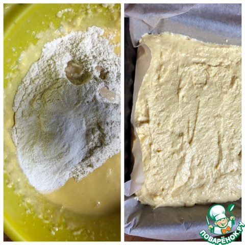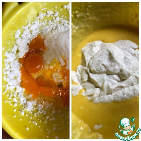 Добавить разрыхлитель и муку, взбить секунд 30. В форму ( 26 см) выложить тесто и отправить в духовку на 40-50 минут при 180 гр. ориентируйтесь на сухую деревянную шпажку.