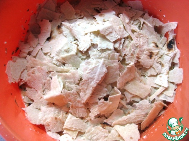 Порвать лаваш на маленькие кусочки и добавить к остальным ингредиентам.